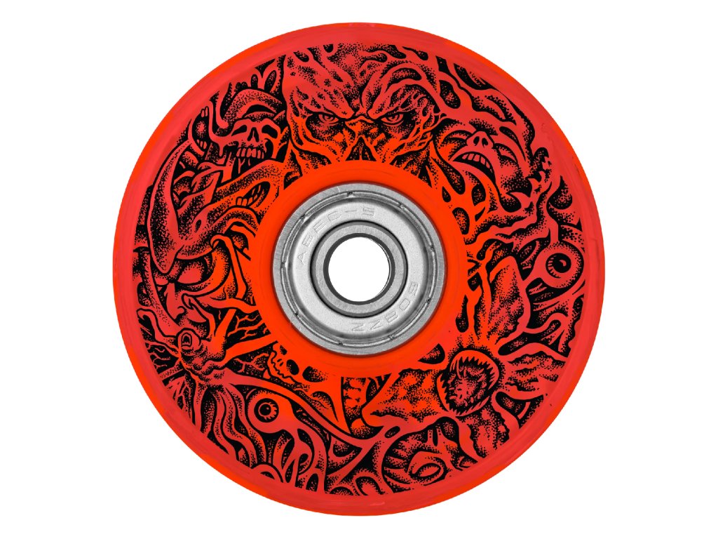 Svíticí kolečka Slime Balls Stranger Things Hellfire Club OG Slime Red 66mm, 78a jsou vybavena technologií svícení s grafikou Santa Cruz Slime Balls x Stranger Things Hellfire Club.