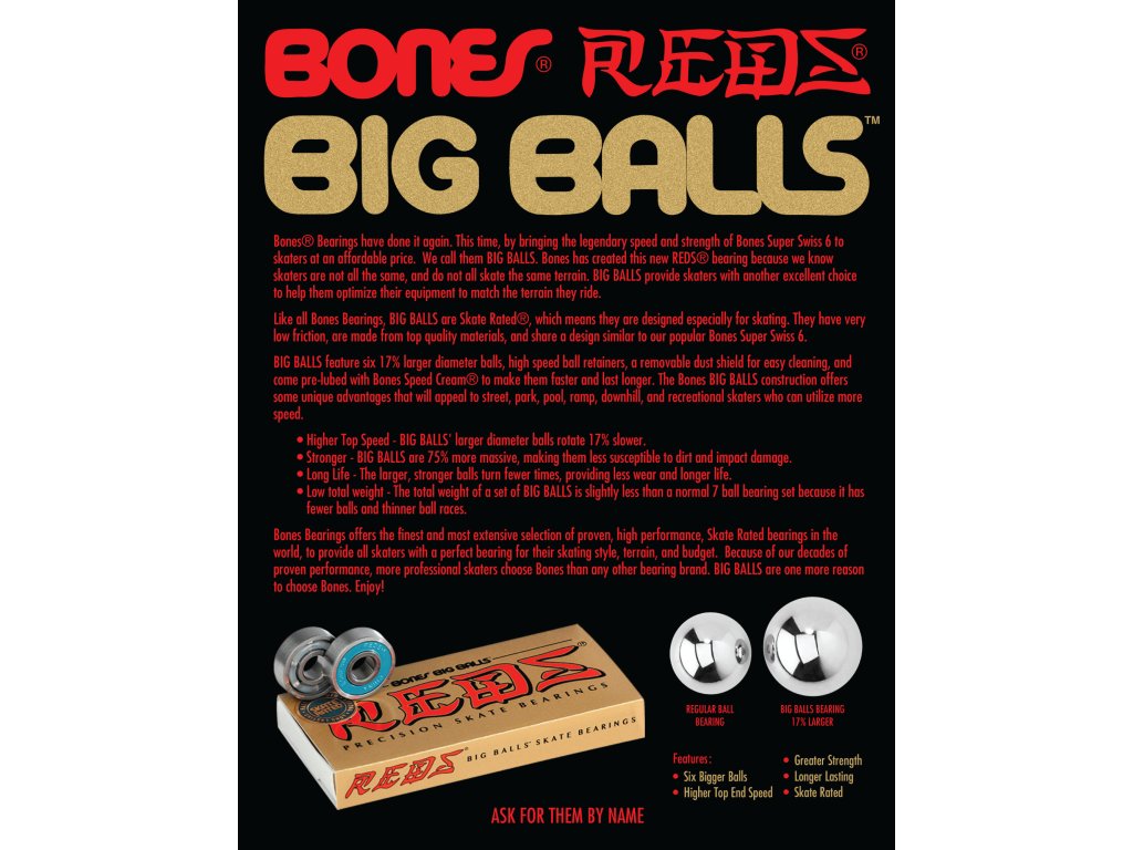 Ložiska Bones BIG BALLS®, jsou nejnovějším členem rodiny REDS. Velké kuličky jsou navrženy tak, aby se pohybovaly rychleji a déle vydržely. Mají o 17% větší kuličky, jako legendární ložiska Bones Super Swiss 6. Tyto větší kuličky umožní jet rychleji na jakékoliv nerovnosti, která zpomaluje menší kuličky. Díky tomu jsou BIG BALLS skvělou volbou pro skejtry, kteří hledají vyšší rychlost a delší životnost ložisek. Skaters si si volí ložiska Bones REDS #1 díky konzistentní kvalitě, rychlosti, trvanlivosti a hodnotě.
